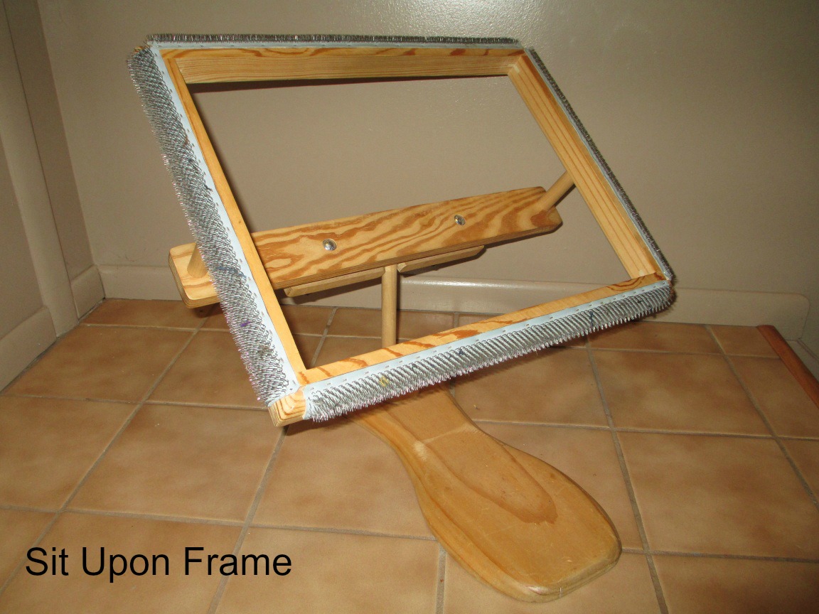 When I first started rug hooking I bought a Puritan frame and it served me well for a long time. Then I started seeing frames that you could sit on - and they swiveled and tilted so I thought that would be a good feature to have so it would be easier to hook in every direction. I bought a new frame from a seller on ebay - The Purple Crow - and I've been happy with it for years. Two years ago at the thrift store I found a nice floor model needlework frame for $15 and bought it - hoping it could be adapted to work with my rug hooking frame. Over the weekend my son-in-law took it home and made it happen for me - I think it's going to be great! I can adjust the angle of the surface, and it can collapse it down to be a more compact size for traveling. I look forward to giving this a try and seeing how it works - and it will be easy to move the frame back to the old base whenever I want/need to.